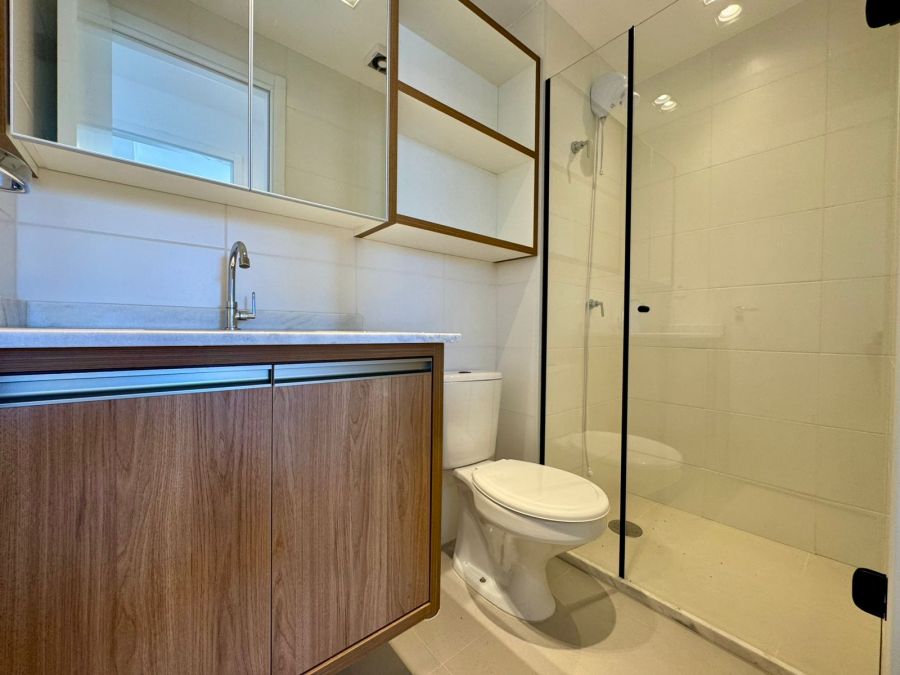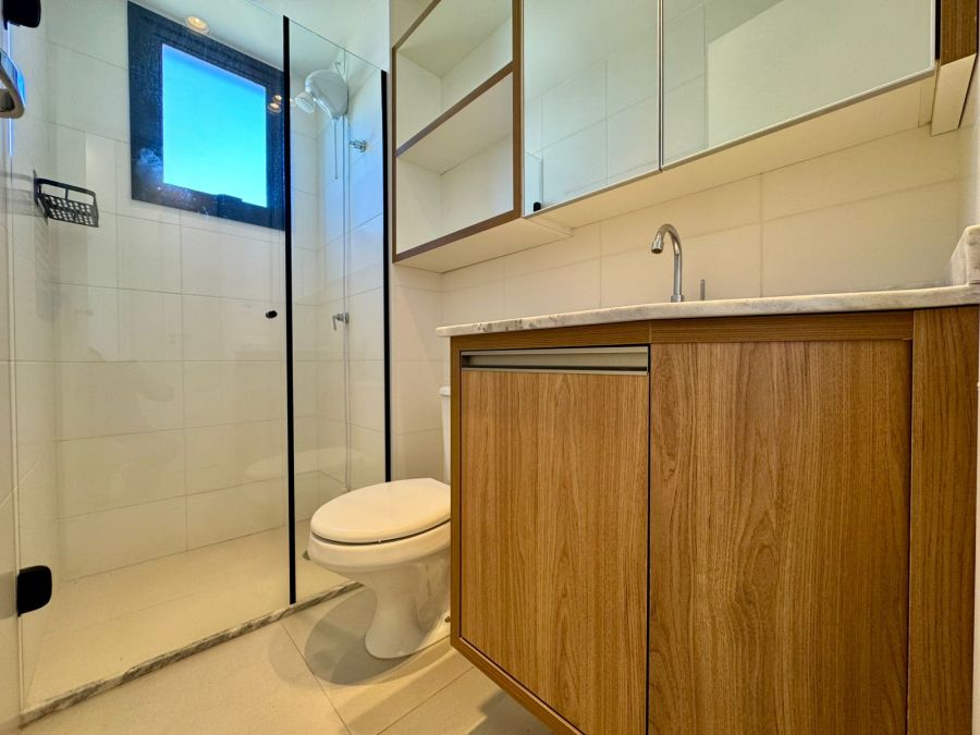 Banheiro social com armário, espelho e box em Blindex