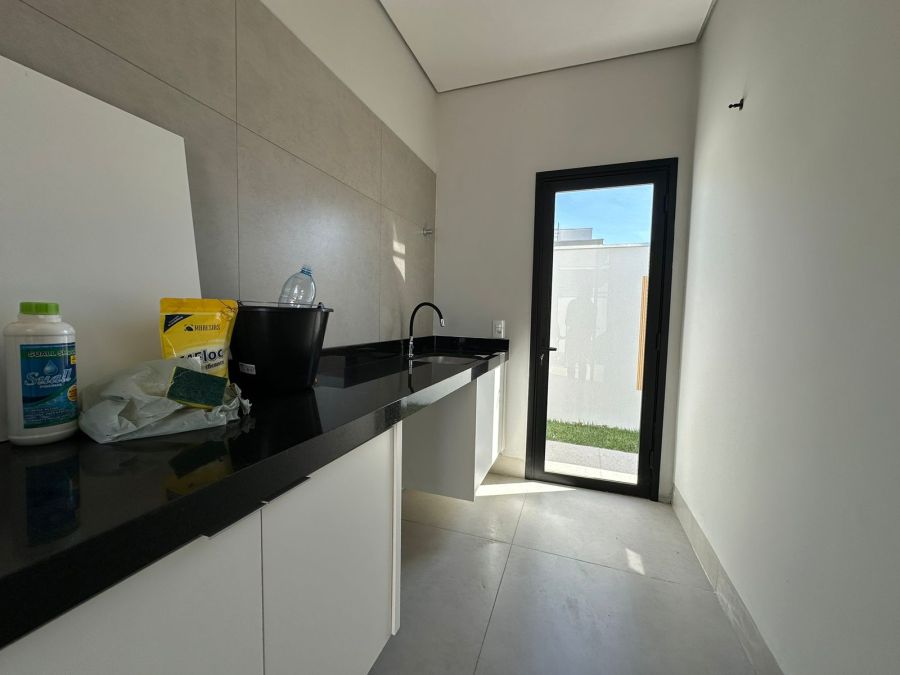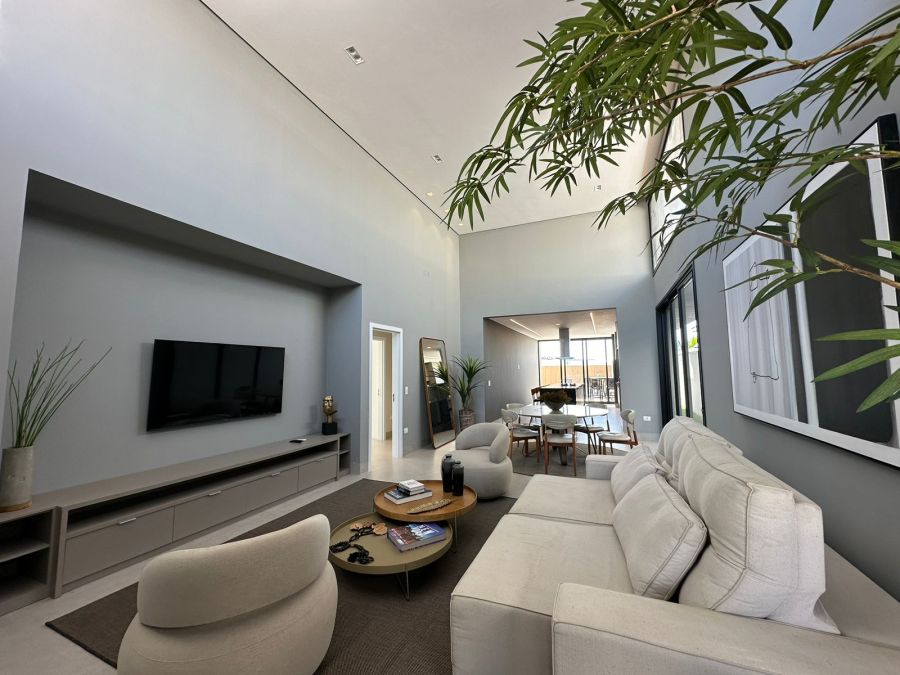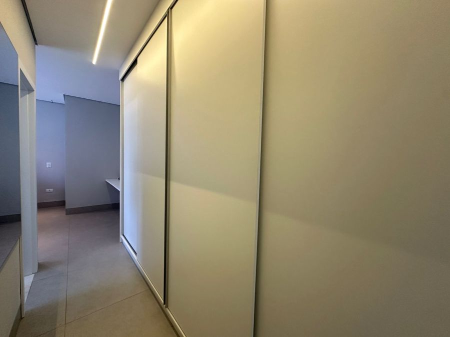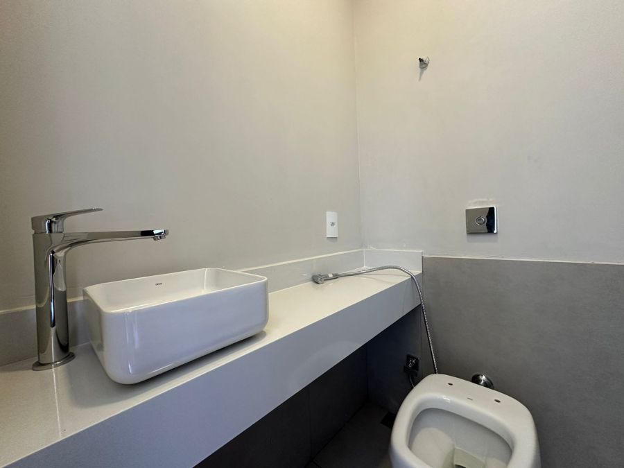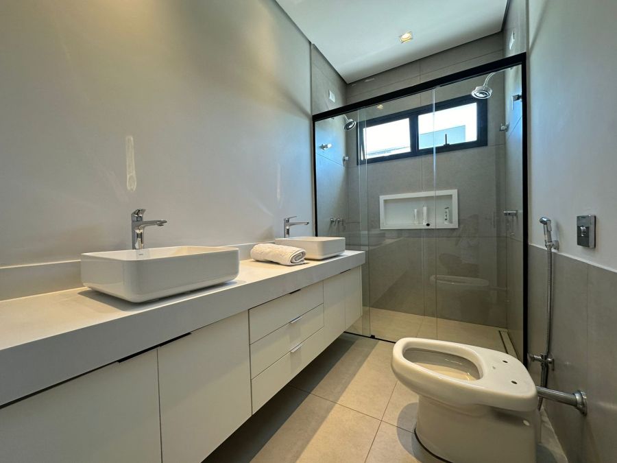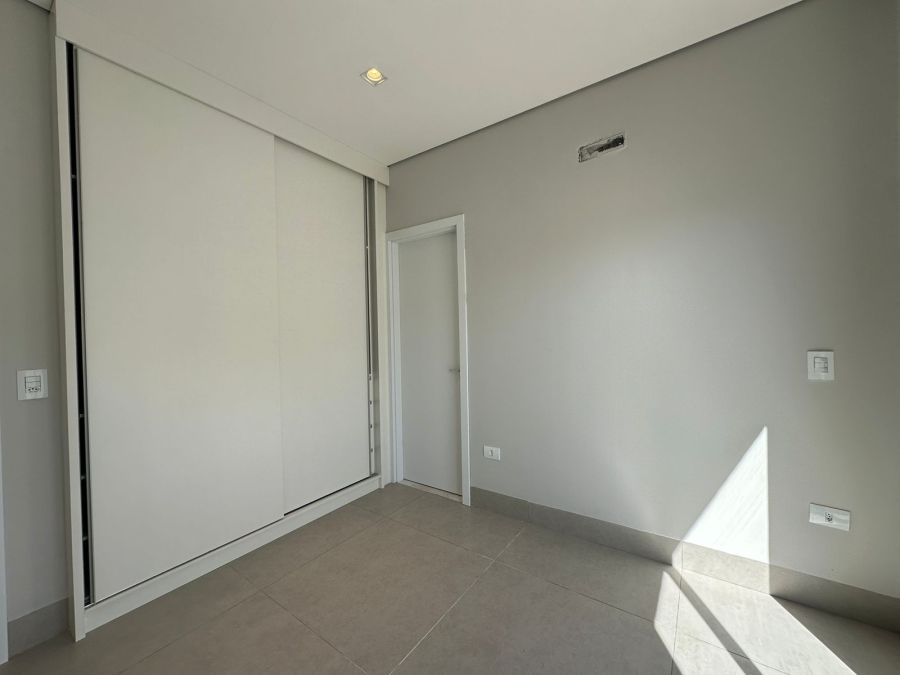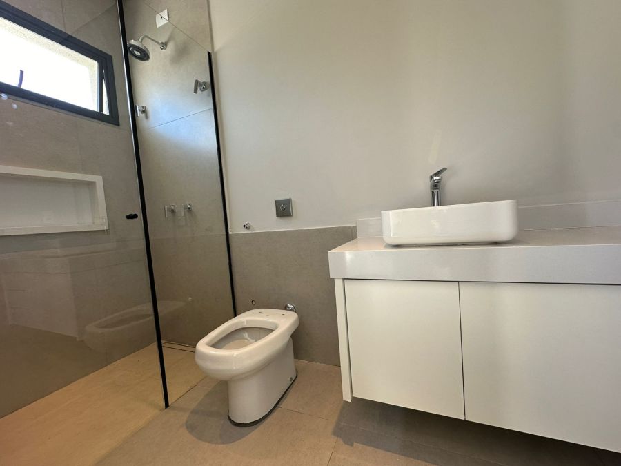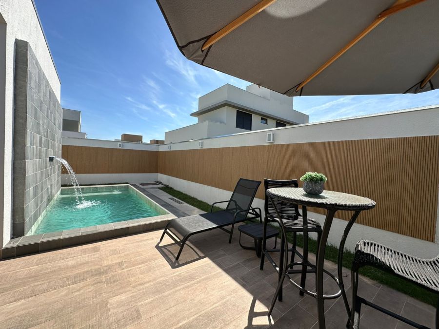 Três quartos com suíte, 4 banheiros, sala integrada com sala de jantar, cozinha, churrasqueira, piscina, dispensa, e já vem com os armários.