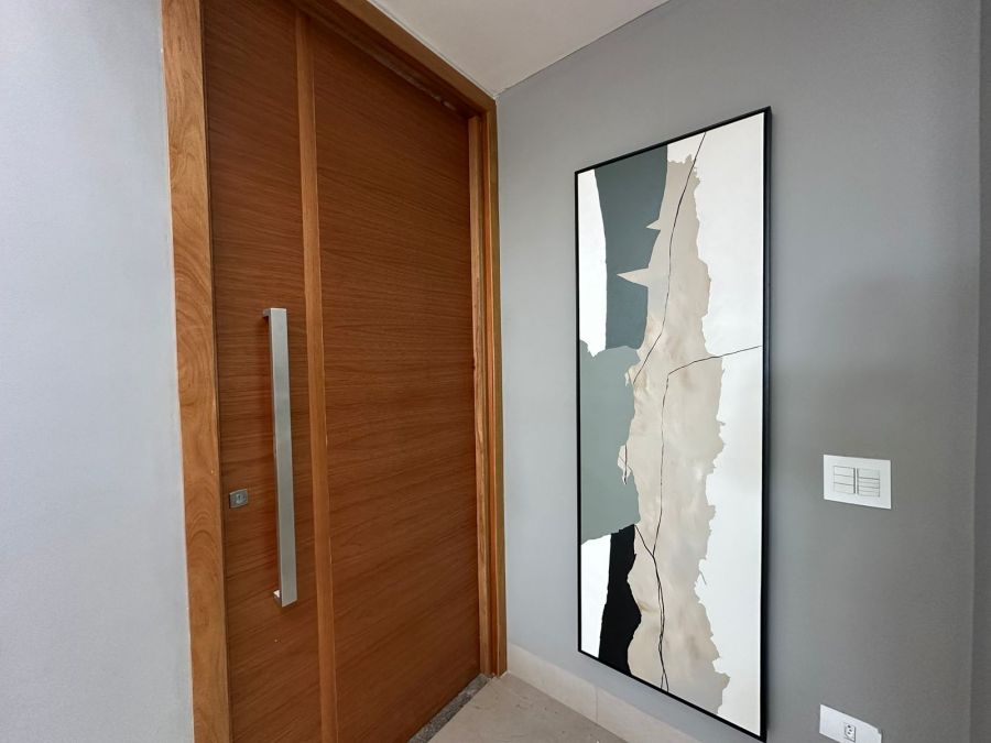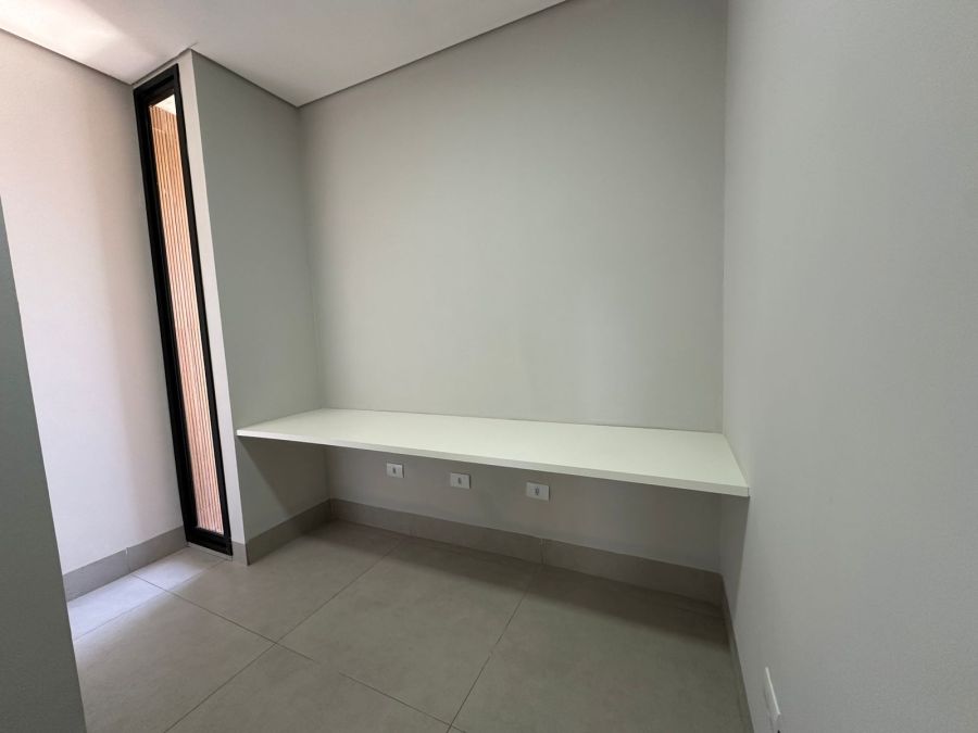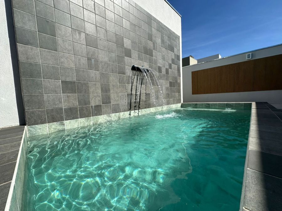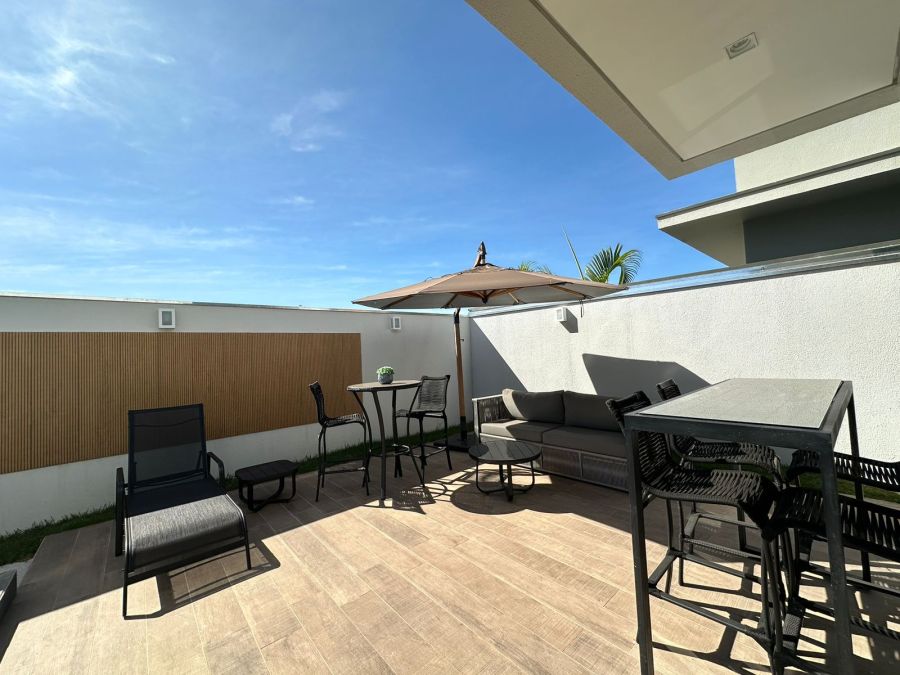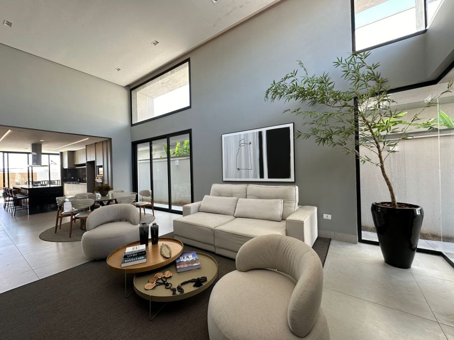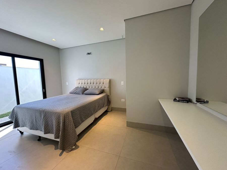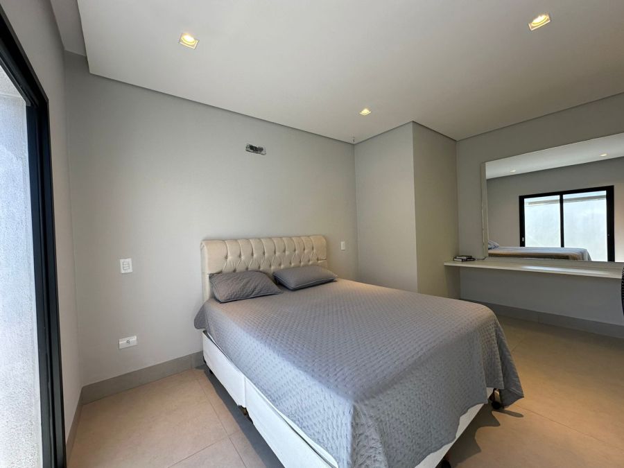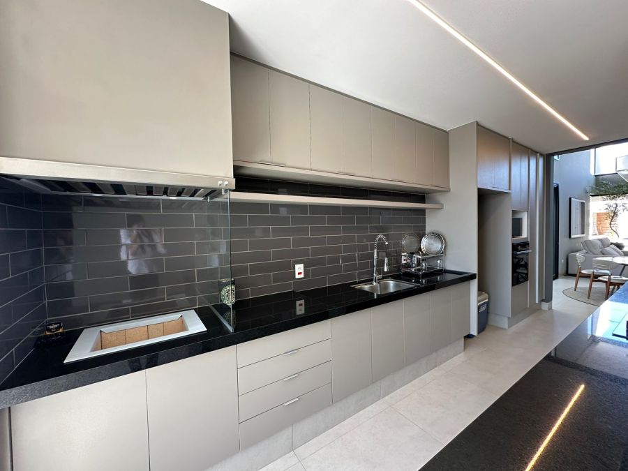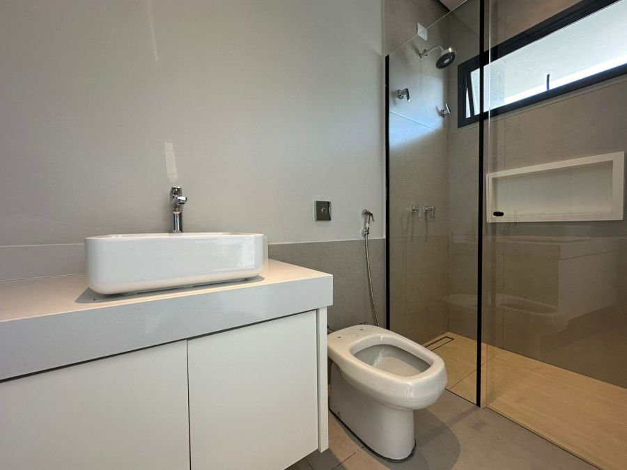 Três quartos com suíte, 4 banheiros, sala integrada com sala de jantar, cozinha, churrasqueira, piscina, dispensa, e já vem com os armários.